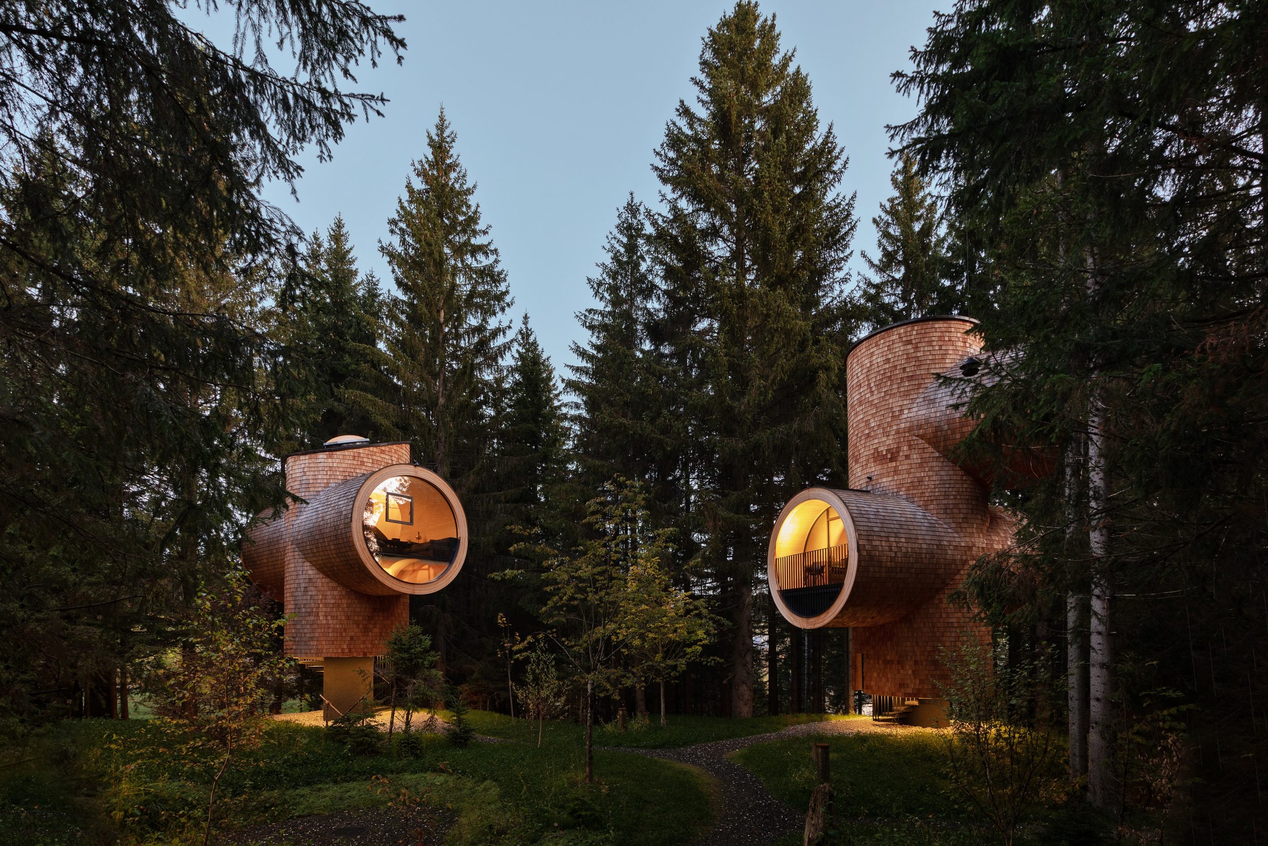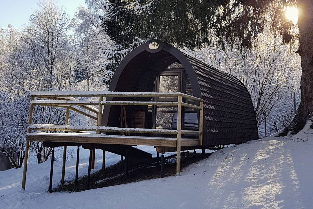 Zum Beispiel in einem von vier Baumhäusern, die optisch allesamt fast schon etwas an das Periskop eines U-Boots erinnern – oder (etwas weniger weit hergeholt) an einen Baumstamm. Wie es sich für Baumhäuser gehört, stehen die Teile mitten im Wald gegenüber vom Wirtshaus. Gebaut sind sie aus Holz und unterteilt in drei Stockwerke, wo Schlaf-, Wohn- und Badezimmer untergebracht sind. Achtung: Unbedingt früh genug reservieren, die Unterkünfte sind heiß begehrt!