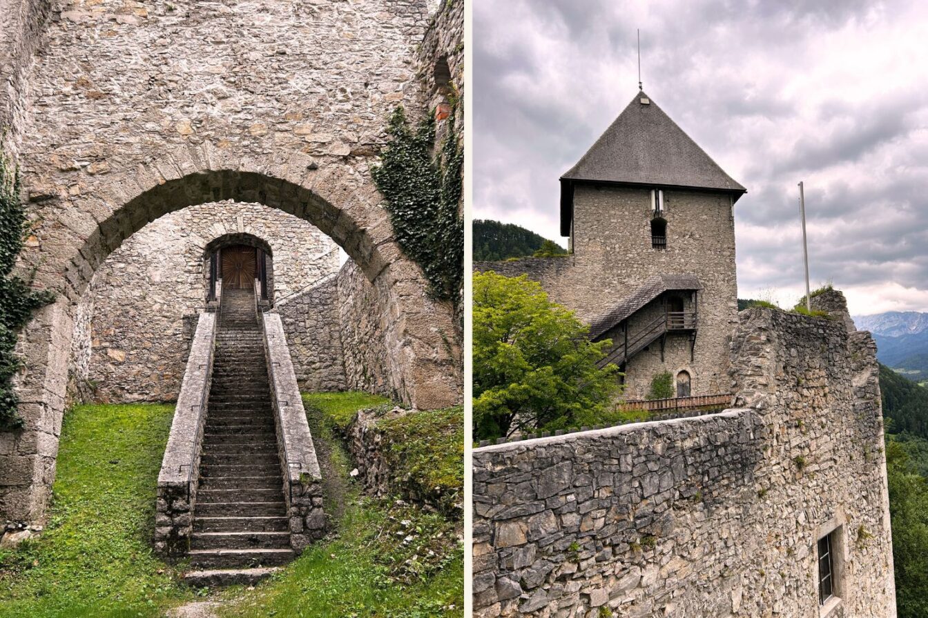 Wir haben uns diesmal aber lieber die Burgruine Gallenstein in St. Gallen angesehen. Sie diente den Mönchen des Stifts Admont schon im 13. Jahrhundert als Fluchtburg, wenn das Stift in Kriegszeiten nicht mehr sicher war. Hoch oben thront sie über dem Tal. Und dennoch erreicht ihr sie in nur wenigen Gehminuten vom Parkplatz aus.