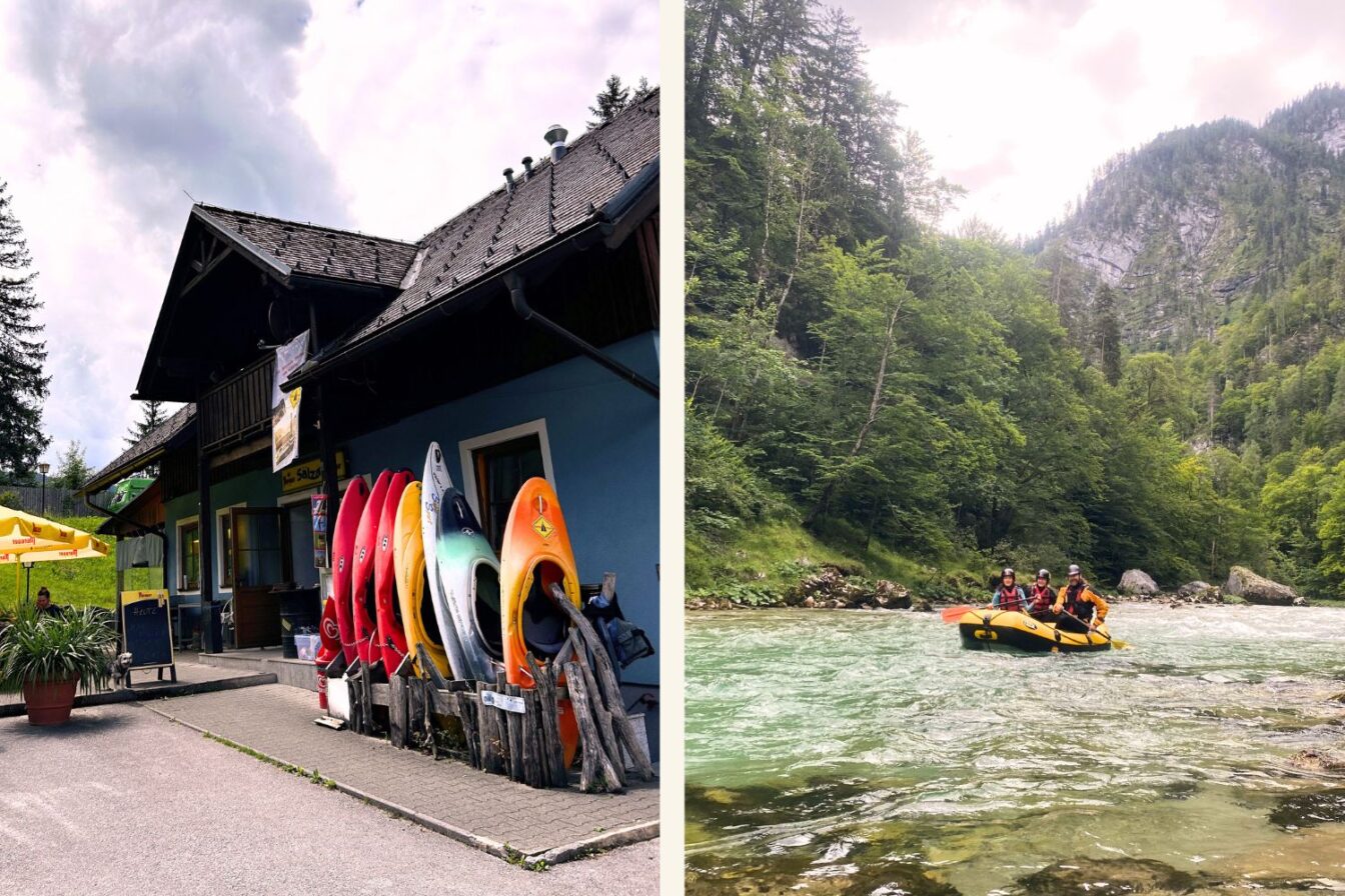 Im Sommer führt er weniger Wasser, also ist auch die Raftingtour weniger wild – einige Stromschnellen und Adrenalin-Kicks hatte sie aber dennoch für uns im Angebot. Neben Halbtages- gibt es auch Ganztagestouren, Kanu-Kurse oder Canyoning-Abenteuer. Und das zum Camp gehörige Gasthaus versorgt euch im Anschluss mit einer kleinen oder großen Stärkung. Da kommt tatsächlich ordentlich Surf-Stimmung auf, mitten in Österreich.