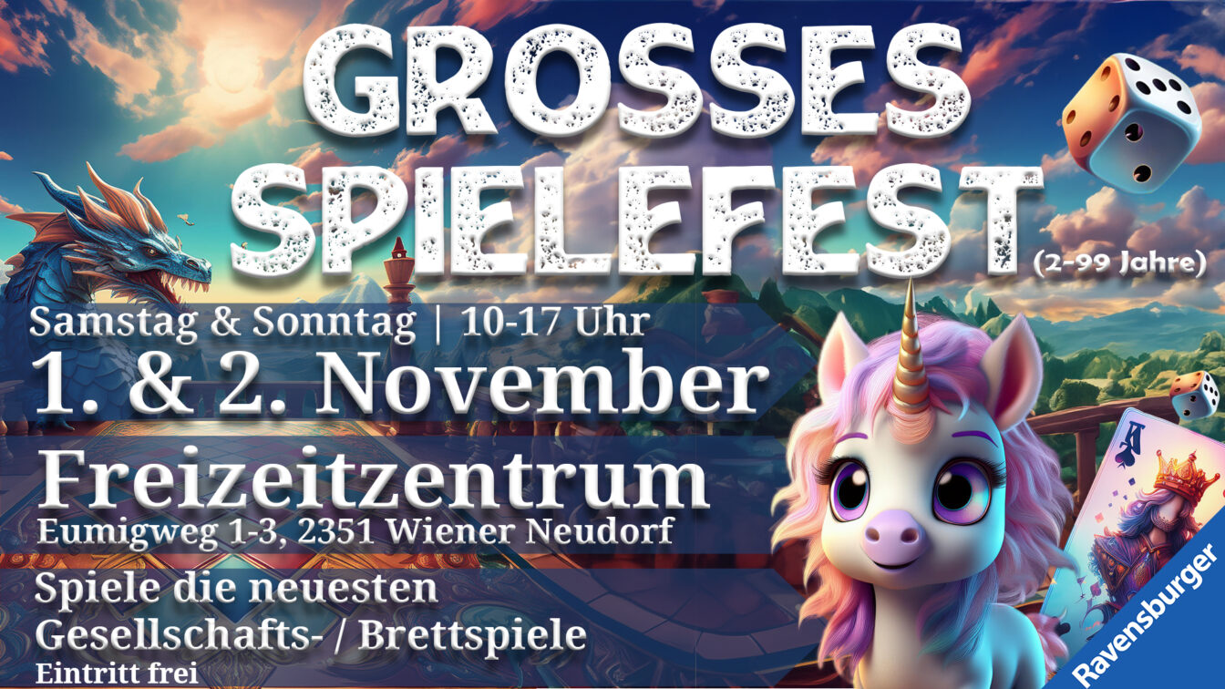 Die entscheidenden Würfel sind gefallen, das große Spielefest steht vor der Tür: am 1. und 2. November 2025 verwandelt sich Wiener Neudorf in ein Mekka für Fans von Brett- und Kartenspielen. Alle sind willkommen, egal ob jung oder alt – dementsprechend gibt es auch Spiele, die eine große Bandbreite an Interessen und nötigen Fähigkeiten abdecken. Ein perfektes To-do für die Herbstferien!