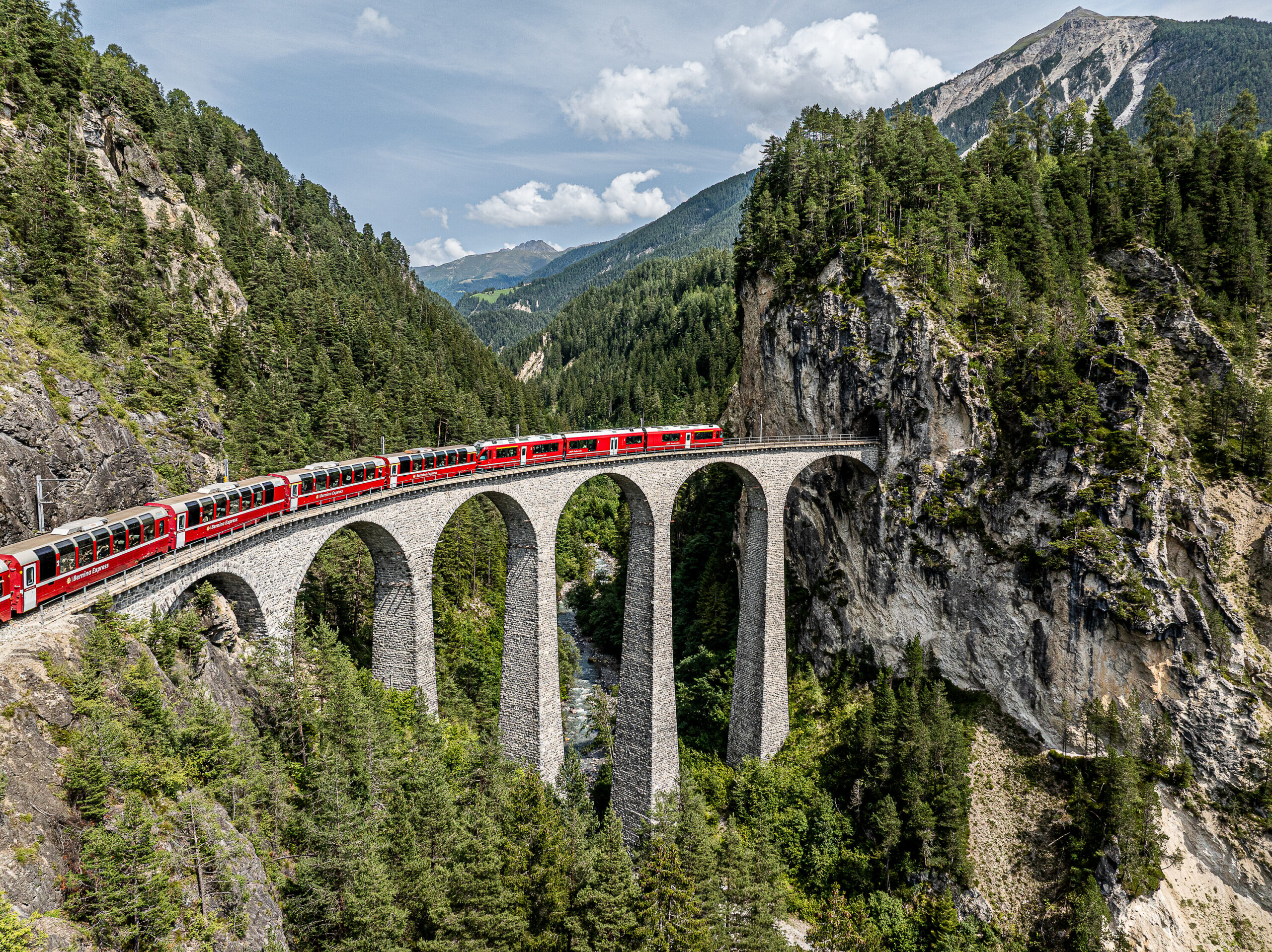 • abwechslungsreiche Strecke mit 196 Brücken, 55 Tunneln und Landwasserviadukt