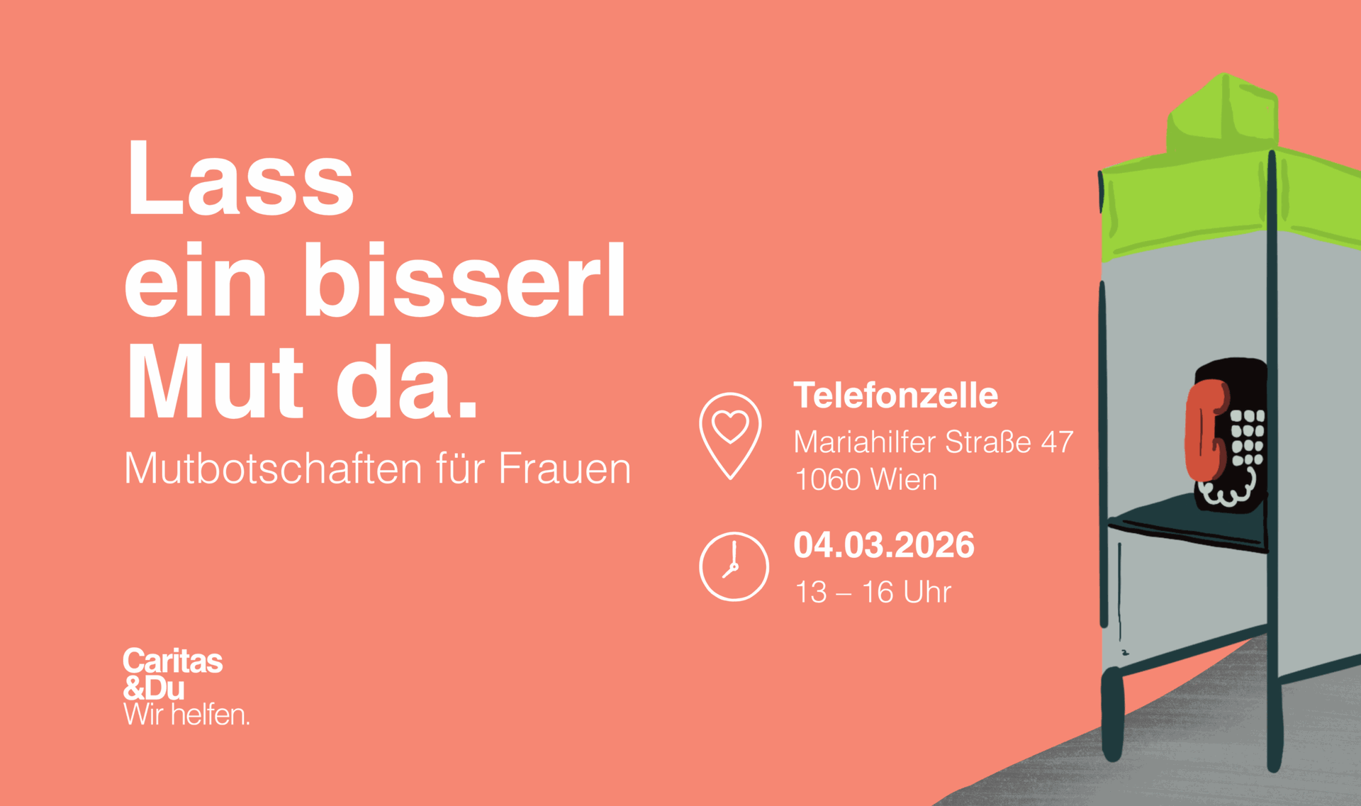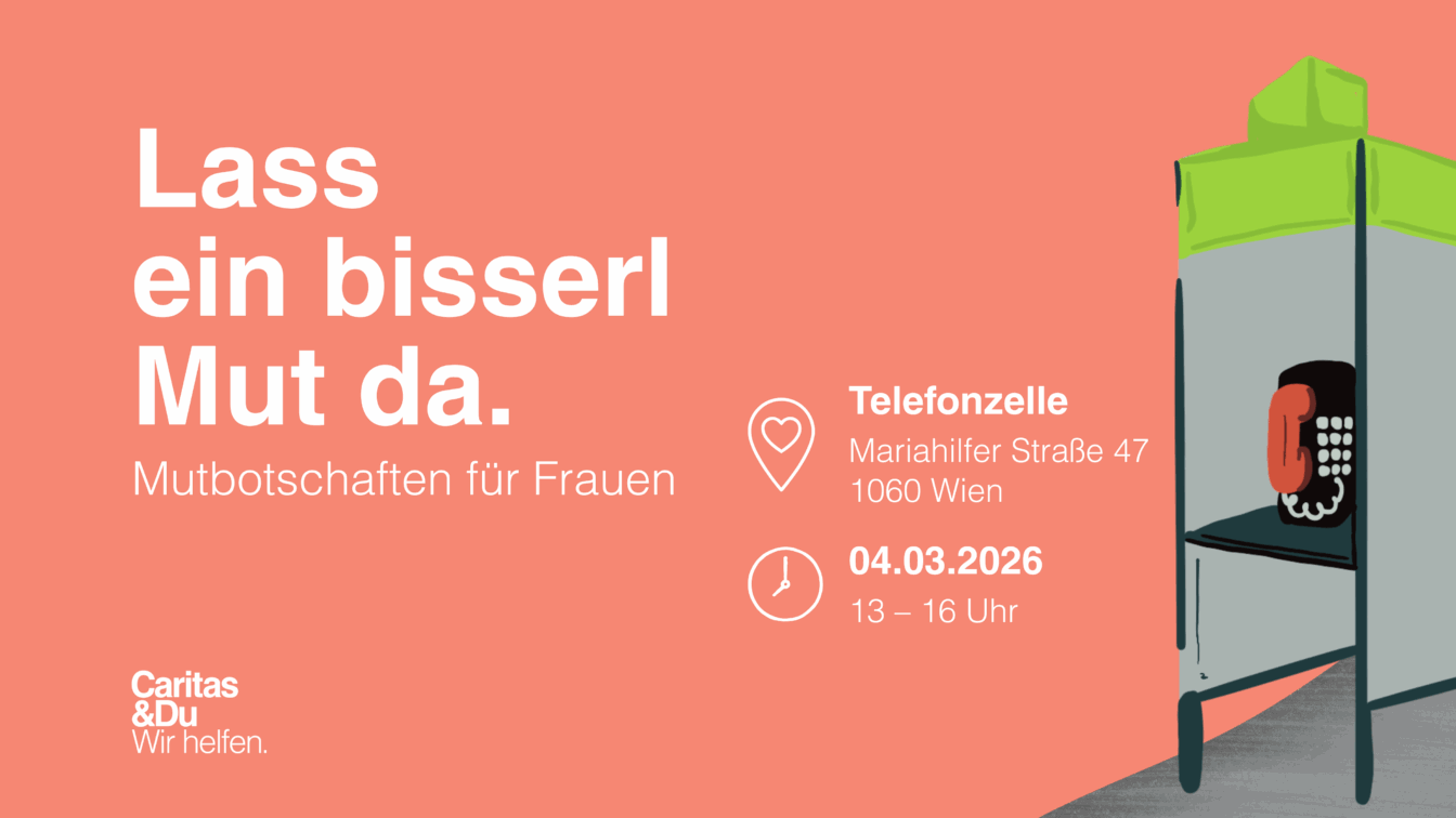 Im Zuge des Weltfrauentags 2026 will die Wiener Caritas mit einer Mitmach-Aktion in Wien ein Zeichen setzen und zur Solidarität mit Frauen aufrufen. Dafür verwandelt sich am 4. März 2026 eine Telefonzelle auf der Mariahilfer Straße 47 zu einem Ort für Ermutigung: Von 13 bis 16 Uhr könnt ihr vor Ort persönliche Mutbotschaften für Frauen verfassen, die anschließend auch übermittelt werden.
