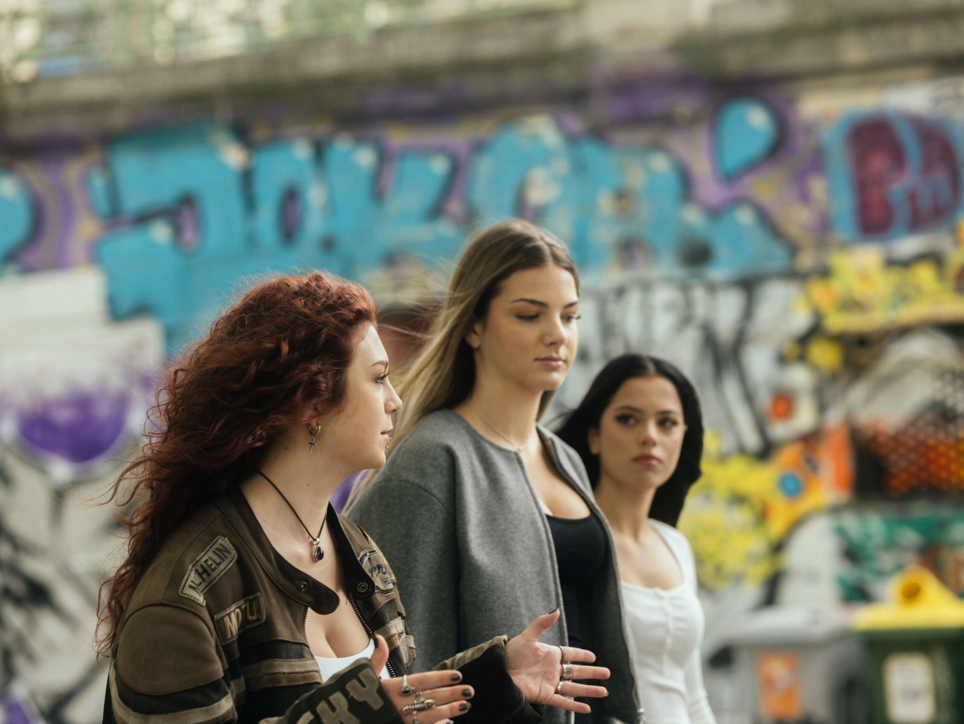 Drei Frauen spazieren vor Graffiti am Donaukanal
