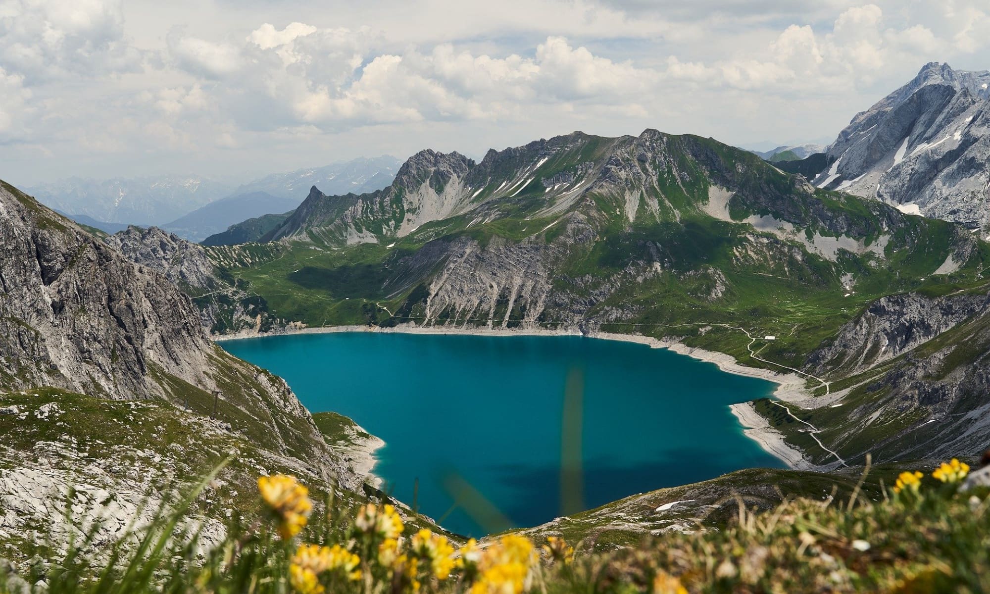 Auf unserer Reise zu den schönsten Bergseen starten wir im Ländle. Der Lünersee ist einer der größten Seen in Vorarlberg und liegt auf einer Seehöhe von 1.970 Metern am Fuße der Schesaplana. Eine Möglichkeit, zum See zu gelangen, ist der Aufstieg von der Talstation der Lünerseebahn über den Bösen Tritt. In etwa einer Stunde Gehzeit bewältigst du knapp 500 Höhenmeter auf einer Strecke von zwei Kilometern. Oben angekommen, streckst du am besten zur Erfrischung deine Füße gleich in den kühlen See.
