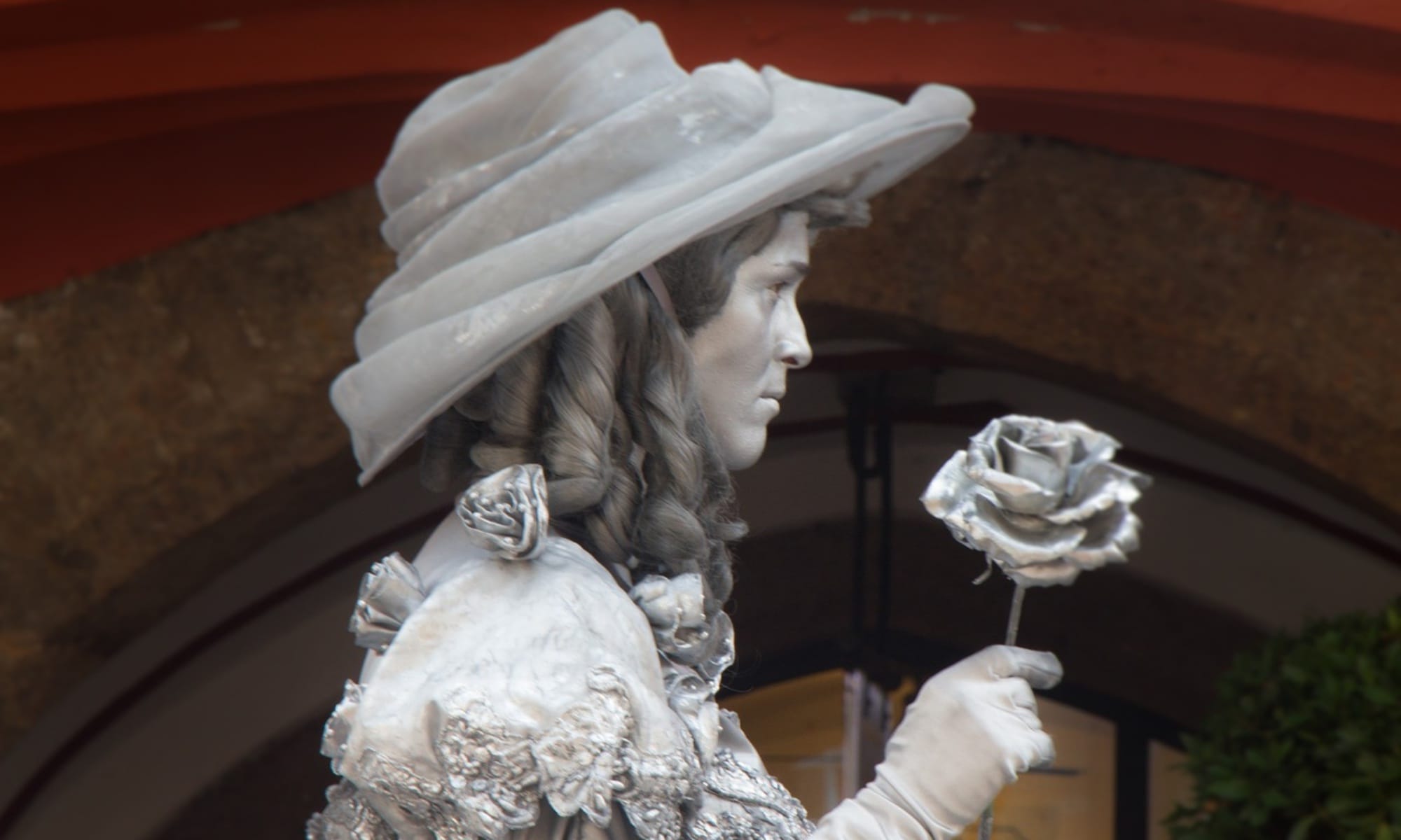Wie fast jeden Tag schnappt sich Maria in der Früh ihren Hund Canelo und fährt mit dem Rad zur Arbeit. Am Ende der Innsbrucker Maria-Theresien-Straße, der größten Touri-Meile der Stadt, macht sie halt – nur ungefähr eine Gehminute vom Goldenen Dachl entfernt. Auf der Toilette eines Lokals in unmittelbarer Nähe schmiert sie sich Gesicht und Hals mit Feuchtigkeitscreme ein und spachtelt sie mit silberner Schminke zu. Alles ist Silber: Lippen, Augenlider, Nasenflügel. Ihr Hut und die Perücke aus Korkenzieher-Locken – ebenfalls Silber. Maria kehrt zurück auf die Straße. Mitten auf der beginnenden Herzog-Friedrich-Straße, in die die Maria-Theresien-Straße mündet, stellt sie ihr kleines Podest im Säulen-Look auf. Sie schlüpft in ihr aufwändiges Rokoko-Kleid, steckt Canelo in einen Retro-Kinderwagen, den sie neben ihre Säule stellt, und steigt aufs Podest. Und genau da wird sie die nächsten Stunden stehen. Starr. Fast unbeweglich. Nur ab und zu ein Zwinkern hier oder ein Luftkuss da. Eine lebendige Statue.