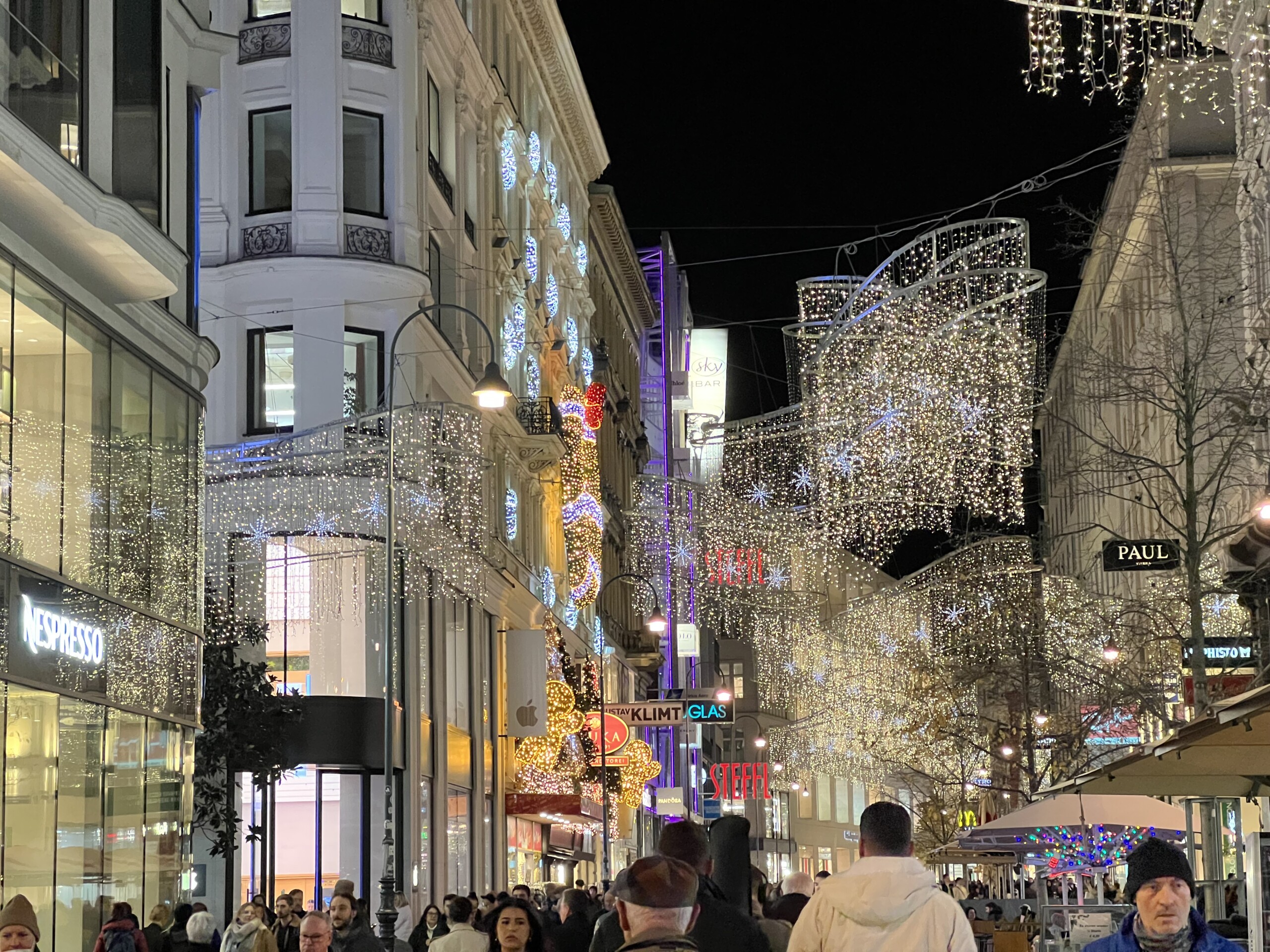 Die Weihnachtsbeleuchtung in der Annagasse, einer ruhigen und beschaulichen Seitengasse der geschäftigen Kärntner Straße, ist eine Hommage an die Musik. Das ist kein Zufall, denn am Ende der Gasse liegt das Haus der Musik. Falls ihr euch fragt, welche Noten dort zu lesen sind: Die Noten stellen den ersten Takt des Liedes „Stille Nacht“ dar.