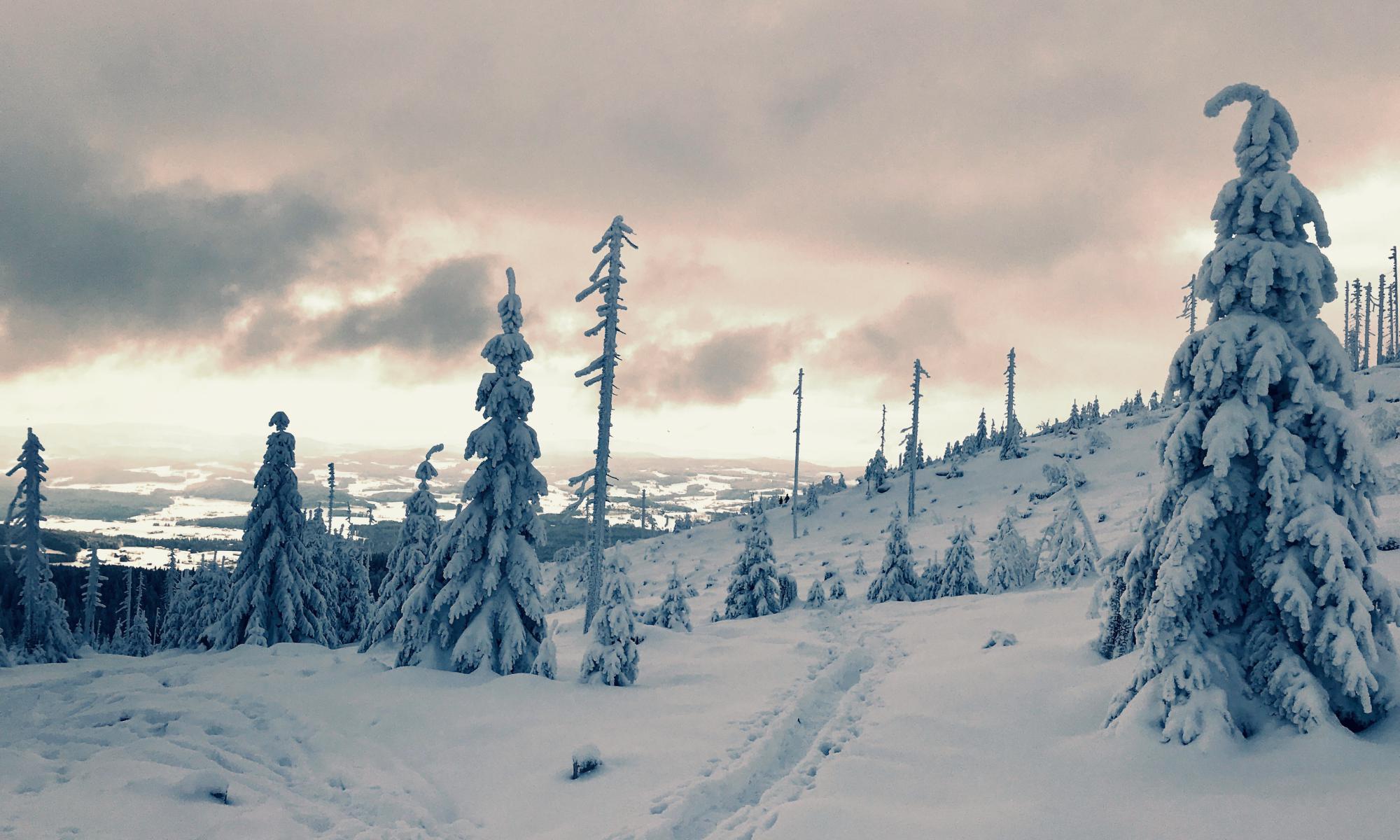 Die Stürme der vergangenen Jahre haben die Gipfelkuppe baumfrei gemacht. Ein Wald toter Bäume steht ein Stück weiter unten und sorgt für bei Nebel gruselige oder bei Sonnenschein atemberaubend schöne Stimmung. „LANDESGRENZE“, verrät ein Schild im Schnee. Willkommen auf dem Plöckenstein! Hier, am Dreiländereck im Norden Oberösterreichs, ist das Schneeschuhwandern ein einziger Genuss. Ausgangspunkt ist das Skizentrum Hochficht, das ihr über Aigen und Klaffer erreicht und von wo aus es noch weitere, leichtere Schneerouten gibt.