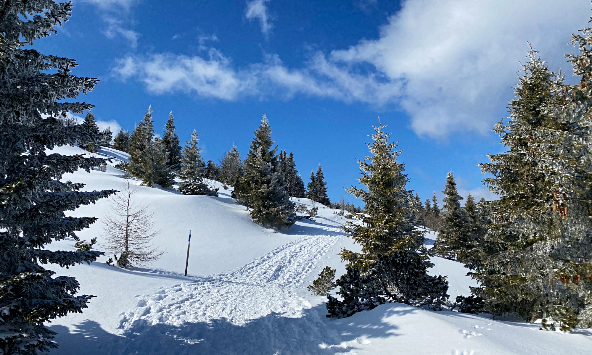 Auch am Semmering erwartet euch eine einfache und aussichtsreiche Schneeschuhwanderung. Besonders reizvoll ist die Tour für alle Sonnenanbeter*innen, denn sie befindet sich auf der Sonnenseite. Ihr startet eure Wanderung am Fuße des Pinkenkogels bei der Passhöhe Semmering, wandert vorbei am Beschneiungsteich und entlang von Forststraßen. Die Route ist zwar nicht beschildert (unbedingt das Datenblatt mitnehmen!), meistens findet ihr aber eine Spur vor, der ihr folgen könnt. Die Tour ist etwa 6,5 Kilometer lang und ihr seid etwa zweieinhalb bis drei Stunden unterwegs. Ihr erreicht den Ausgangspunkt direkt mit dem Auto, oder ihr spaziert etwa 20 Minuten von der Zugstation Semmering zur Passhöhe.