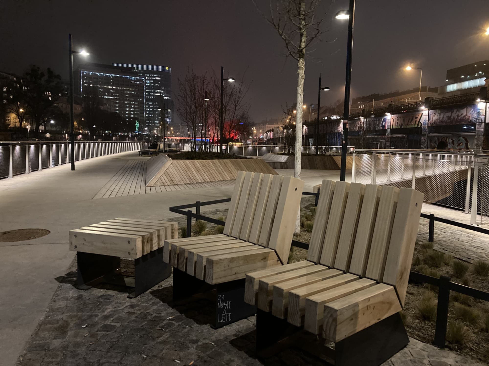 Dabei ist es egal, ob ihr flussaufwärts bei der Spittelau beginnt oder entgegen des Flusslaufs bei der Aspernbrücke startet. Wer gleich zu Beginn die coolen Graffitis bestaunen möchte, startet bei der Spittelauer Lände und spaziert über die Friedensbrücke, weiter zur Rossauer Lände. Wer eine kurze sportliche Einlage machen möchte, findet dort die entsprechenden, öffentlichen Geräte dazu. Ansonsten solltet ihr die Kamera gezückt halten, denn einige Kunstwerke wurden entlang des Weges installiert und auch die Brücken sind mit kleinen Licht-Installationen verziert. Pause macht ihr dann am besten auf halber Strecke: die schwimmenden Gärten, kurz unterhalb vom Flex, könnt ihr gar nicht verfehlen.
